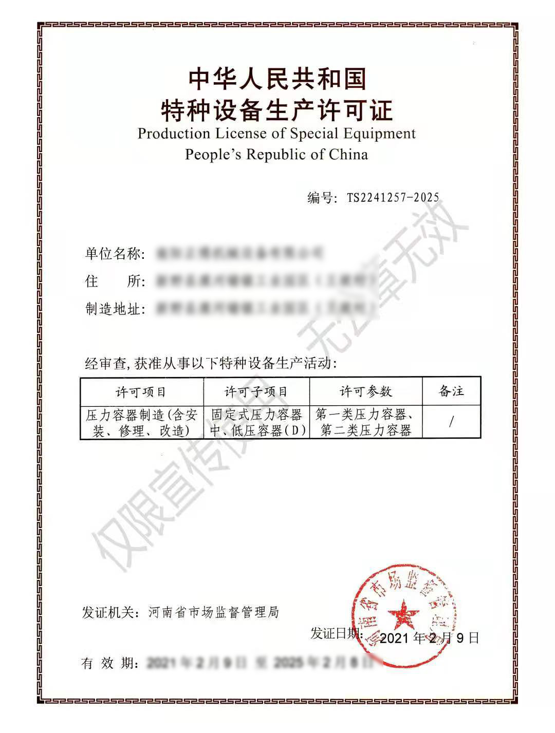 特種設備生產許可證