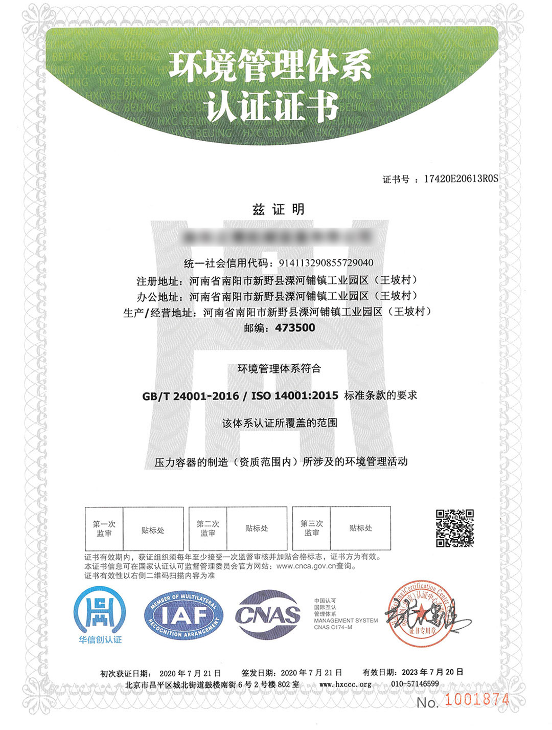 環(huán)境體系認證證書