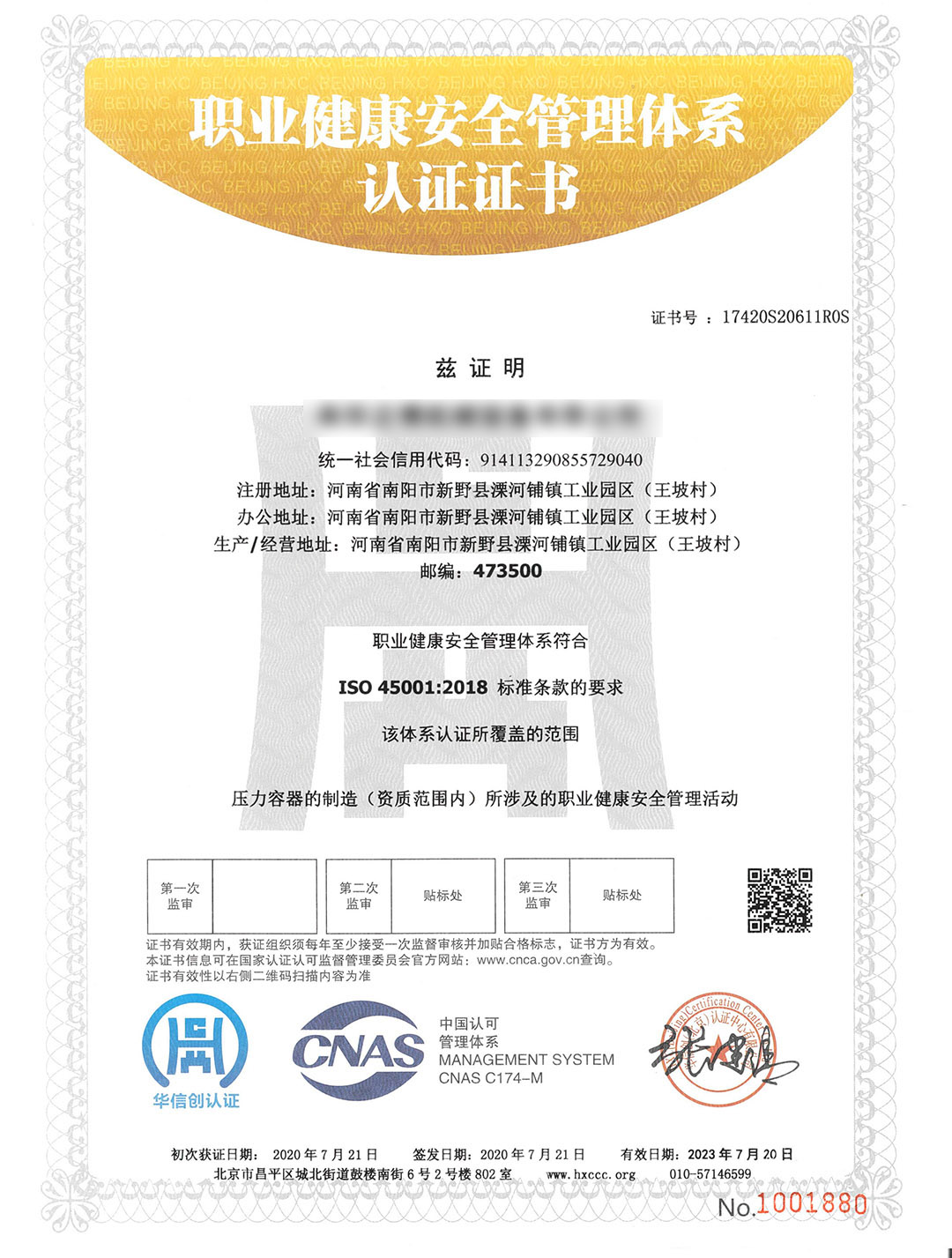 職業(yè)健康安全管理體系證書